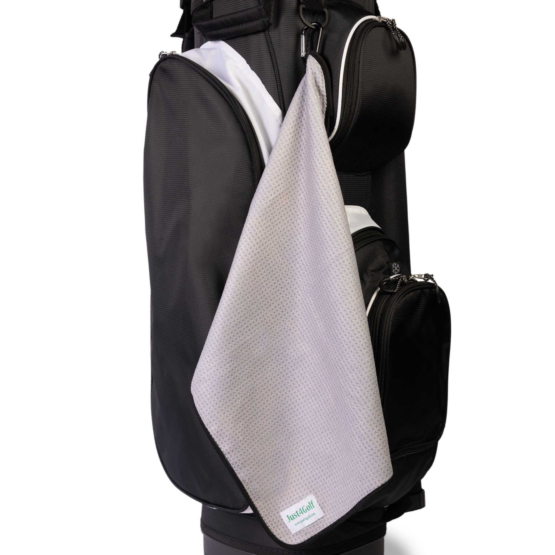 New lightweight golf towel from Just4Golf! Two-tone light waffle weave with gray on back side and black trim. Round corners - hangs nicely on golf bag with clip. Available in 5 colors: black/gray, rust orange/gray, turquoise/gray, hot pink/gray, navy blue/gray. Easy to wash and clean. 21 in. X 15.5 in. Microfiber polyester, imported. Click the color circle you want and add to cart.
